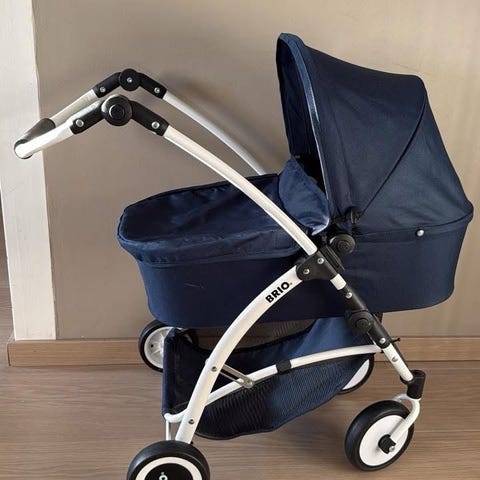 BRIO barnevogn laget i rotting med fire hjul. Barnevognen har et håndtak for enkel skyving og er designet for lek. Materialet er naturlig rotting, og den har en åpen kurvform.