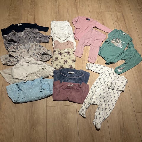 Klespakke i str 62-68-74, noen få plagg i 56. Selges billig for å få det bort. Kr 200,-