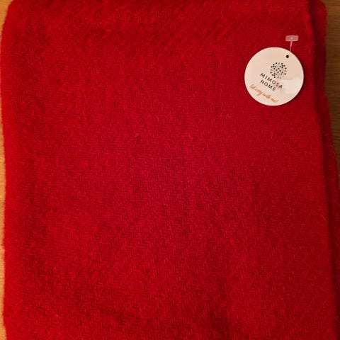 Rød ullpledd med frynser, finsk design. Pleddet er laget av 100 % ull. Jeg har tatt fram pleddet kun i julen, men det kan brukes året rundt for den som er glad i rødt.
