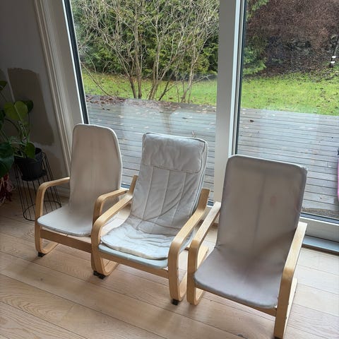 IKEA lenestol til barn med trearmstøtter og grått polstret sete og ryggstøtte.