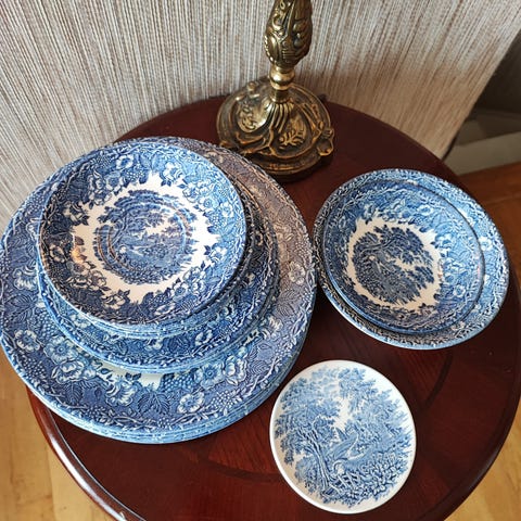 Lignende Staffordshire floral suppeskåler (21 cm) selges brukt 50–150 kr/stk på internasjonale markeder.