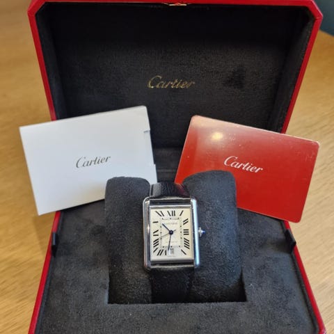Selger/bytter en svært elegant og tidløs Cartier Tank Solo, referanse WSTA0030. Dette er en klassisk dressklokke med ikonisk design som aldri går av moten, og passer like godt til hverdags som til formelle anledninger.