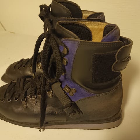 Skytterjakke i størrelse 176 cm med svart og blå farge. Jakken har forsterkede områder på ermene. Materialet ser ut til å være en kombinasjon av tekstil og skinn. Jakken er designet for skyttere og har flere knapper foran. Bruksspor og slitasje er synlig på ermene. Mangler 1 knapp