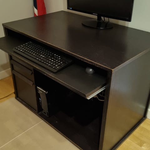 Selger et pent brukt skrivebord med skuffeseksjon. Skrivebordet har uttrekkbar hylle for tastatur og mus. Begge har hjul.