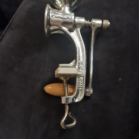 Universal kjøttkvern laget i metall med trehåndtak. Kvernen festes til bord eller benk med klemme. Egnet for manuell kverning av kjøtt og andre matvarer.