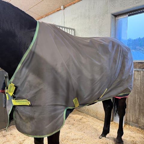 Har blitt brukt på en mørkebrun hest, og har noen flekker. Har ikke vasket teppet el forsøkt fjernet flekkene