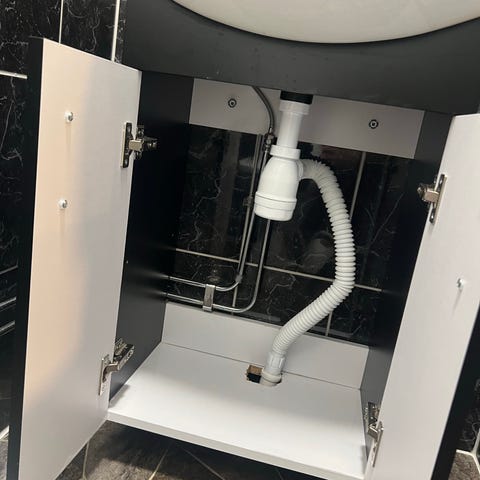 Vegghengt baderomsmøbel med servant, høyskap og rundt speil