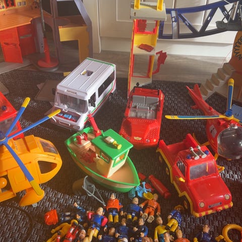 Brannman Sam pakke som inkluderer flere kjøretøy som ambulanse, helikopter, brannbil samt et fyrtårn. Kjøretøyene er i forskjellige farger og laget for lek. Passer for barn som liker å leke med biler og redningskjøretøy.