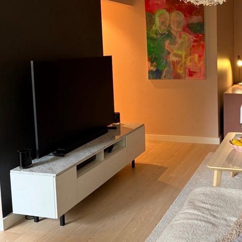 Vegghengt TV og mediemøbel fra danske Frislev (med veggfester). Hvit med grå tekstildører med full lydgjennomtrenging. Pent brukt men et lite bruksmerke på venstre overkant som synes på nært hold. Dører med push-to-open. Må hentes i Oslo.
