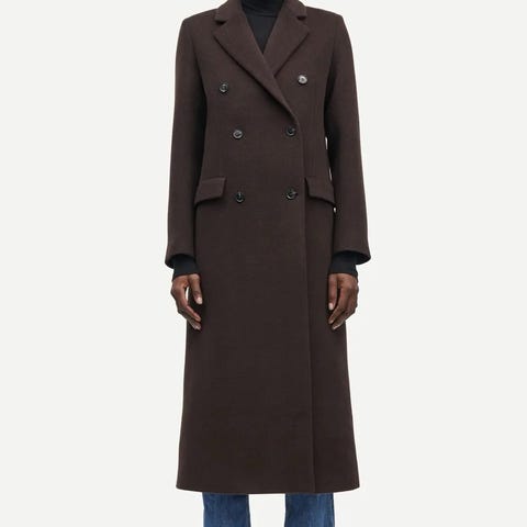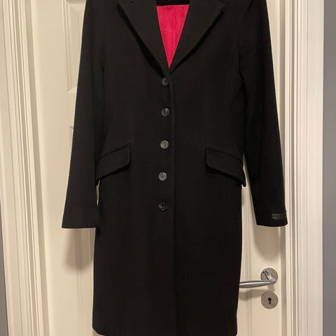 Lindex kåpe i størrelse M for dame. Kåpen er beige og laget av ull. Den har en dobbelspent knappelukking og to sidelommer. Kåpen er foret på innsiden.
