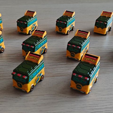 To Turtles kjøretøy leker i forskjellige farger og design. Den ene har et rundt, blått og grønt deksel med detaljer i gult, mens den andre er grønn med svarte og røde detaljer. Begge lekene har hjul og detaljer som etterligner kjøretøy. Pris pr stk.