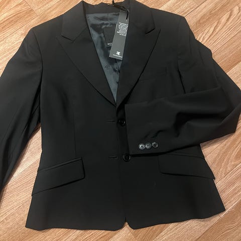 Kort og elegant modell med rene linjer og klaffelommer. Med belte som kan knyttes eller det kan taes av. Kan brukes både til jobb og til mer avslappede antrekk.