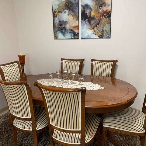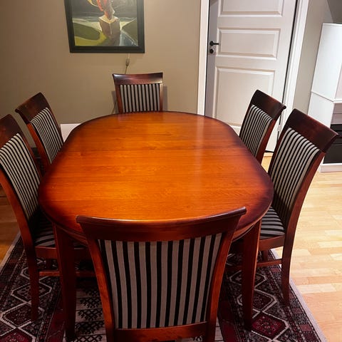 Bordet har 3 ileggsplater og kan enkelt tilpasses både hverdagsbruk og større selskaper. Med alle platene i blir bordet svært romslig. Stolene er av Bellman-modell, med karakteristisk kryssrygg og rosett, og har trukne seter i tidløst stripet stoff.