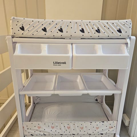 IKEA stellebord i hvit farge. Designet for praktisk bleieskift og oppbevaring av babyutstyr. Bordet har en flat overflate for stellematte og hyller under for oppbevaring. Følger med stellematte. I fin stand, litt bruksslittasje.