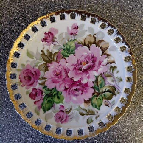 kakefat/ asjett. Kan også henges på veggen som pyntefat. Diameter ca21 cm. Pris 50kr. Må hentes I Skotselv. Sender ikke.
