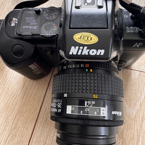 Nikon F70 analogt kamera med objektiv 35-80mm. Filmrull følger med, uvisst kvalitet eller hvilken grad det er brukt.