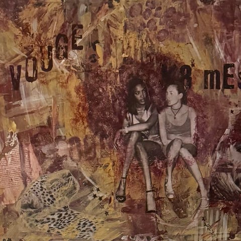 Abstrakt trykkmaleri med bymotiv fra restaurant i varme og mørke farger. Bildet er på lerret og har en kant i samme stil som forsiden. Passer til dekorasjon i hjem eller kontor.