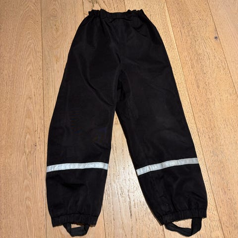 Vind- og vanntett skallbukse med forsterket stoff bak og på knærne, noe som gjør den perfekt for utelek. Buksen har justerbare og avtakbare seler, en justerbar, elastisk midje og elastiske benender med praktiske fotstropper som holder den på plass under lek. Fotstroppene kan enkelt skiftes ut når de er utslitte.