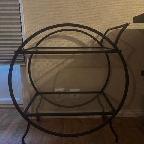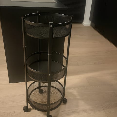 Svart trillevogn/tralle fra Clas Ohlson til oppbevaring.