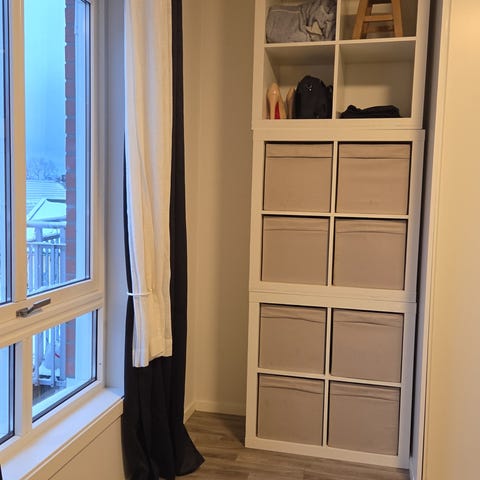 Selger en praktisk og stilren IKEA JONAXEL hylle i hvitt.