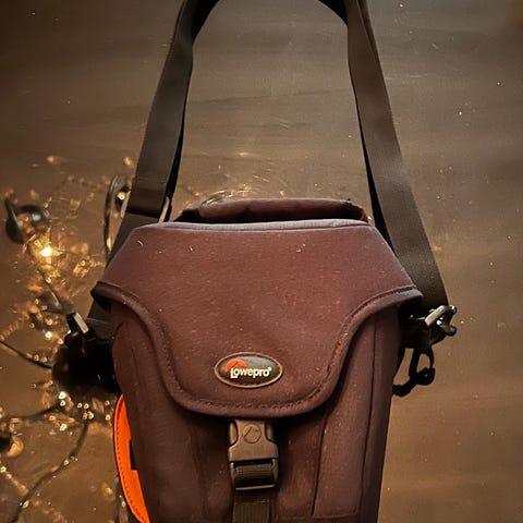 Lowepro Compact kameraveske med svart ytterstoff og oransje innside. Vesken har glidelås, justerbar skulderrem og flere rom for oppbevaring av kamerautstyr. Passer til kompaktkameraer og små tilbehør.