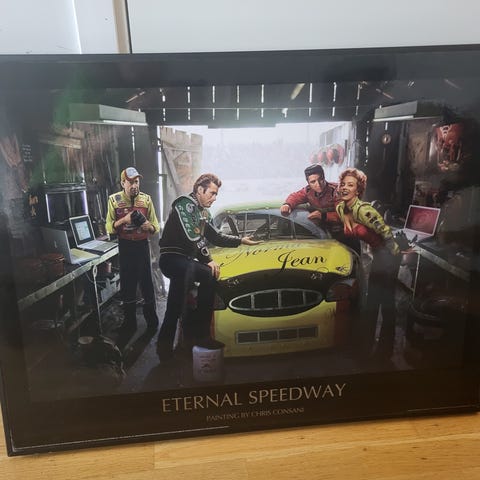 Indianapolis Motor Speedway Hall of Fame Museum dekorasjon med bilder og illustrasjoner fra Indianapolis 500 racet. Inkluderer flere fotografier av racerbiler og førere, samt ikoniske øyeblikk fra racet. Passer som veggdekorasjon for motorsportentusiaster.
