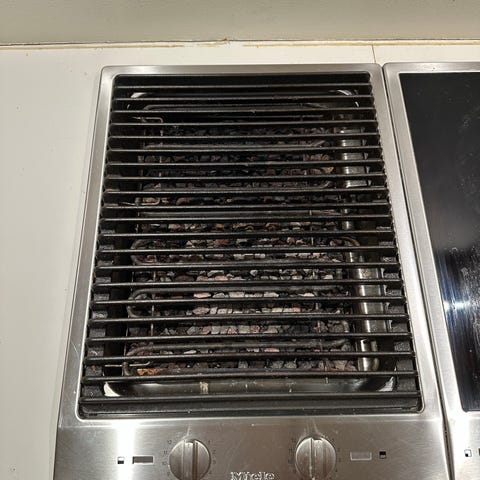 Miele Grill Komfyrtopp med justerbare knotter for temperaturkontroll og avtakbar grillrist. Komfyrtoppen har en rustfri stålramme og et integrert vannoppsamlingskar under grillristen. Designet for innbygging i kjøkkenbenk.