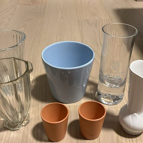 En blomsterpotte, vase og to lysestaker gis bort