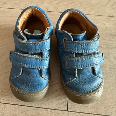 Selger ECCO barnesko i ekte skinn, størrelse 22. Skoene er blå med oransje lisser og praktisk glidelås på siden, som gjør dem enkle å ta av og på.