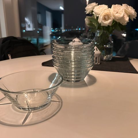Rosendahl glasskåler i sett med tre stk i forskjellige størrelser. Ene store skålen har en liten skår i seg, men ellers ingen skader.
