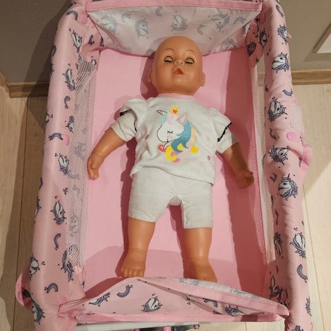 Baby Born dukke iført fargerik pysjamas med hjerteprint. Dukken har bevegelige øyne .