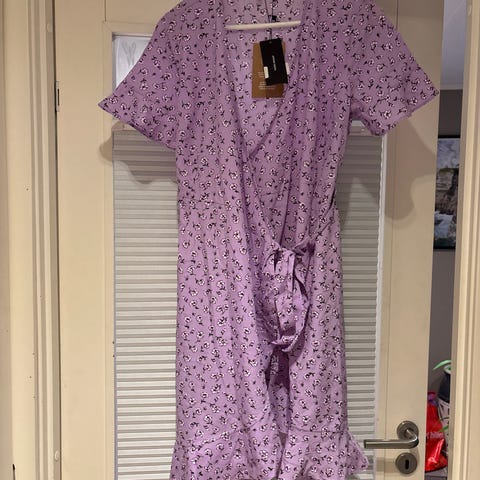 Veldig søt rosa wrap around sommerkjole med motiv av blomster og jordbær. Ubrukt med lapp.