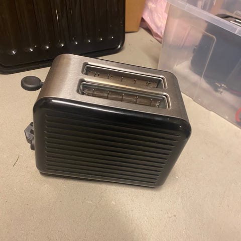 Brødrister i svart farge for to skiver. Den har justerbar bryter på fronten for innstilling av ristningsgrad.