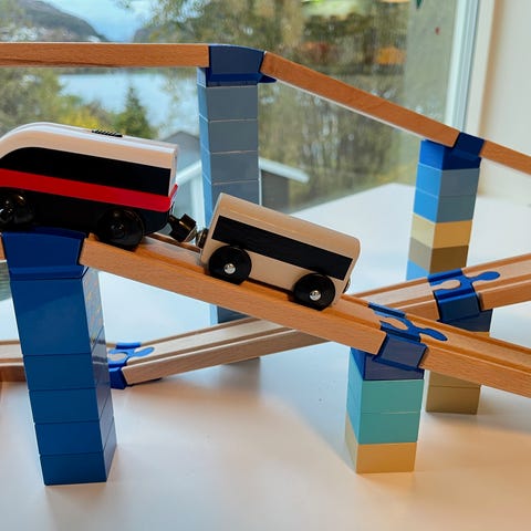 Passer sammen med togskinner fra Brio, Ikea og Biltema.