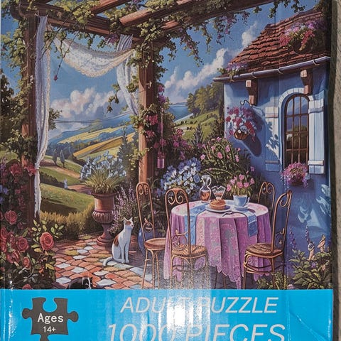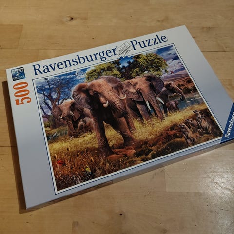 500 brikker puslespill med motiv av et landskap som inkluderer et slott, omgitt av trær og fjell under en blå himmel med skyer.