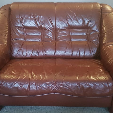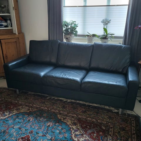 Spesiell sofa, skinn og lin/fjær/dun. 3seter