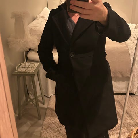 Svart kåpe i 80 prosent ull fra tyske HundHund. Står ikke størrelse, men vil si det er en medium. Oversized passform. Jeg er 178 cm og 38 i overdeler vanligvis. Den når meg til litt over knærne.