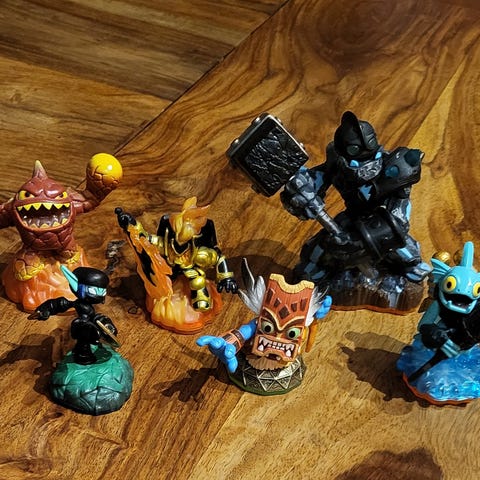Samling av Skylanders figuriner med ulike karakterer og design. Passer til bruk med Skylanders spill og som samleobjekter.