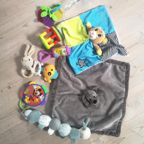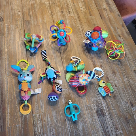 Noen myke bøker, Biteleker, speil, til babygym ( noen mangler kroker) til barnevogn ( den ene mangler kroker), rangler mm.