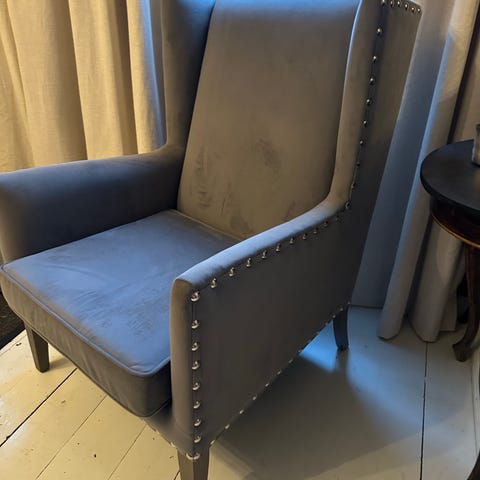 En nydelig kremhvit lenestol kjøpt fra Ellos. Ny pris 4599,-. Svært lite brukt så i god stand. Noen små merker på toppen av stolen, se siste bilde. Er nesten ikke synlig og kan sikkert vaskes bort.