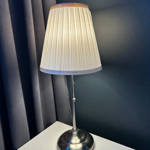Denne nattlampen har en fløyelsskjerm og den gir et ekstra varmt lys, perfekt til kvelden.