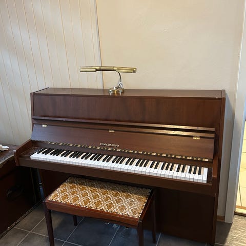 Pianoet har et tradisjonelt design med detaljer i tre og hvite og svarte tangenter. Passer til bruk i hjem eller undervisning. Må stemmes opp. Gis bort mot henting.