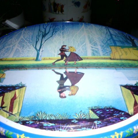 Walt Disney boks Tornerose motiv Vintage, Samleobjekt,Boksen i metall med Tornerose motiv, litt rust inni boksen og bruksmerker, ellers er dem hel og fin, høyde 10 cm og bredde 22 cm i diameter, kan sendes, pris 300 kr
