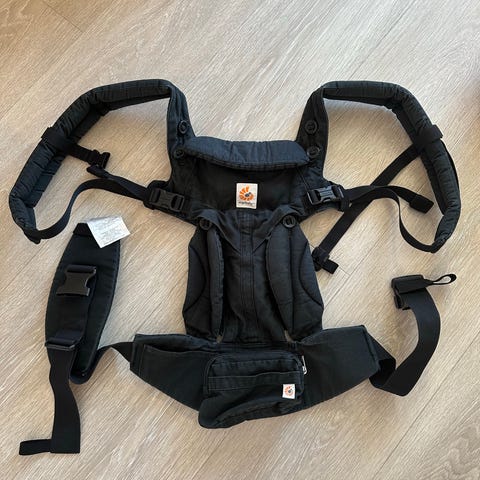 Pent brukt Ergobaby Omni 360 bæresele i blått stoff med hvite mønstre. Bæreselen har justerbare stropper og polstret midjebelte for komfort. Den kan brukes i flere posisjoner for bæring av barn.