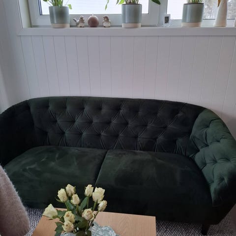 Selger en grønn 2-seters fløyelssofa grunnet flytting.