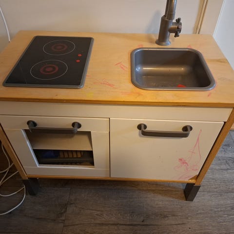 Pent brukt lekekjøkken med kasseapperat, vaffeljern, mixmaster, lite supermarked med mer. Se bilde. Den ene kokeplaten fungerer ikke lyset. Ikke byttet batteri. Noe bruksmerker.