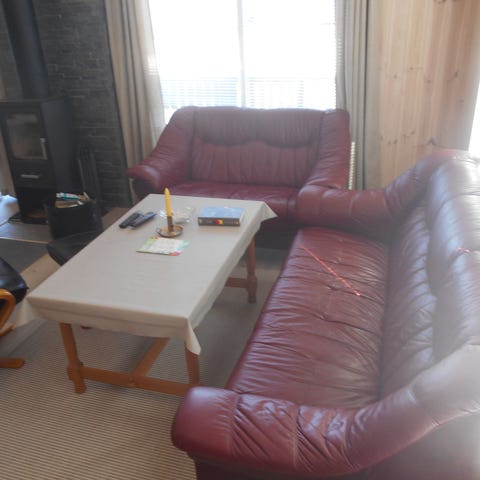 Selger en sofagruppe fra sofa company. Mørk grå stoff, sorte bein.