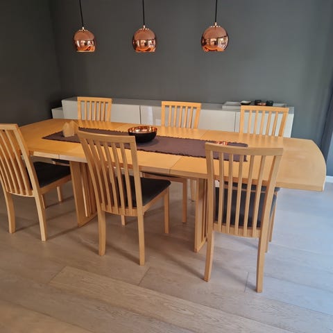 Skovby Spisegruppe med 8 stoler, lengde fra 200 til 356 cm.