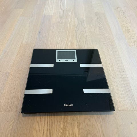 Fitbit Aria Smart vekt i hvit farge. Vekten har et firkantet design med en rund digital skjerm i midten. Den har fire gummiføtter under for stabilitet. Vekten måler kroppsvekt og kan kobles til Fitbit-appen for sporing av helse- og treningsdata.