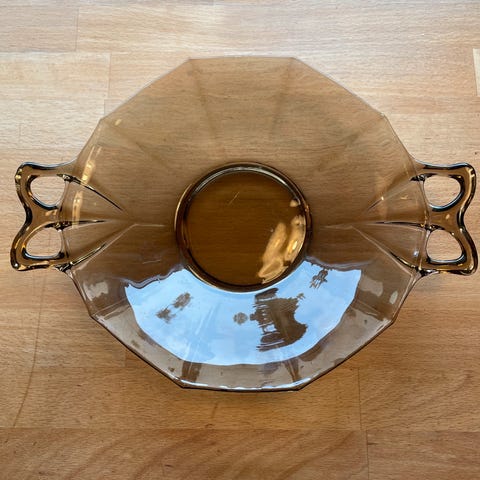 Søt skål formet som en eikenøtt med et ekorn sittende på kanten. Lys brun i fargen.